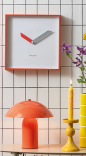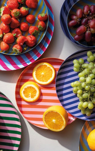 Randiga ser i kontrastfärger, rutiga kul pallar, glasbord i nya former